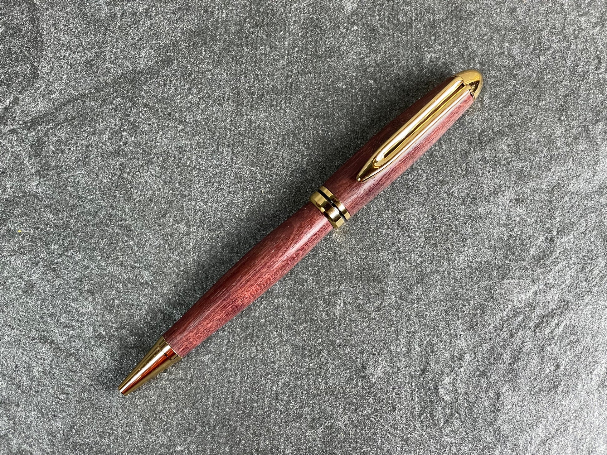 This ballpoint roller pen features 24k gold plating and premium mechanicals from Penn State Industries. I turn it on a lathe, sand and buff to 4000 grit, and add several coats of finish for long-lasting durability. The Euro twist style, appropriate for women or men, has a good heft and is very well balanced. It uses Parker-style refill cartridges. Purpleheart is a durable hardwood from Central and South America.