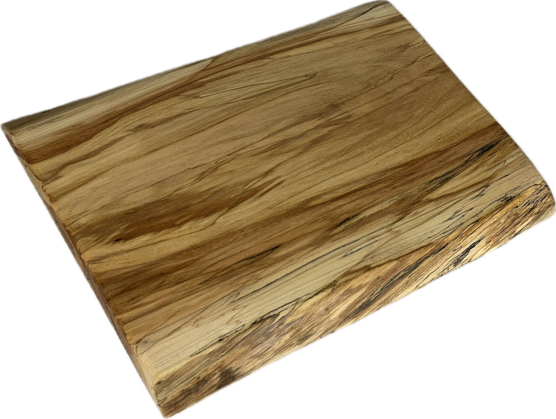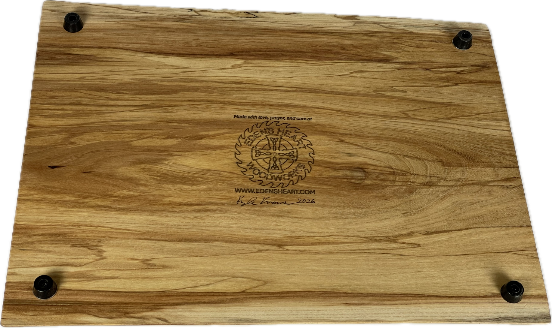 These cutting boards are made of sweet gum, also known as "satin walnut," and feature beautiful interlocked grain patterns. The lumber for these came from a neighbor's tree, which we milled and kiln-dried. These are sanded glass-smooth and finished with food-safe, non-allergenic, heat-treated, filtered walnut oil. They include sturdy rubber feet. They can be custom laser-engraved.