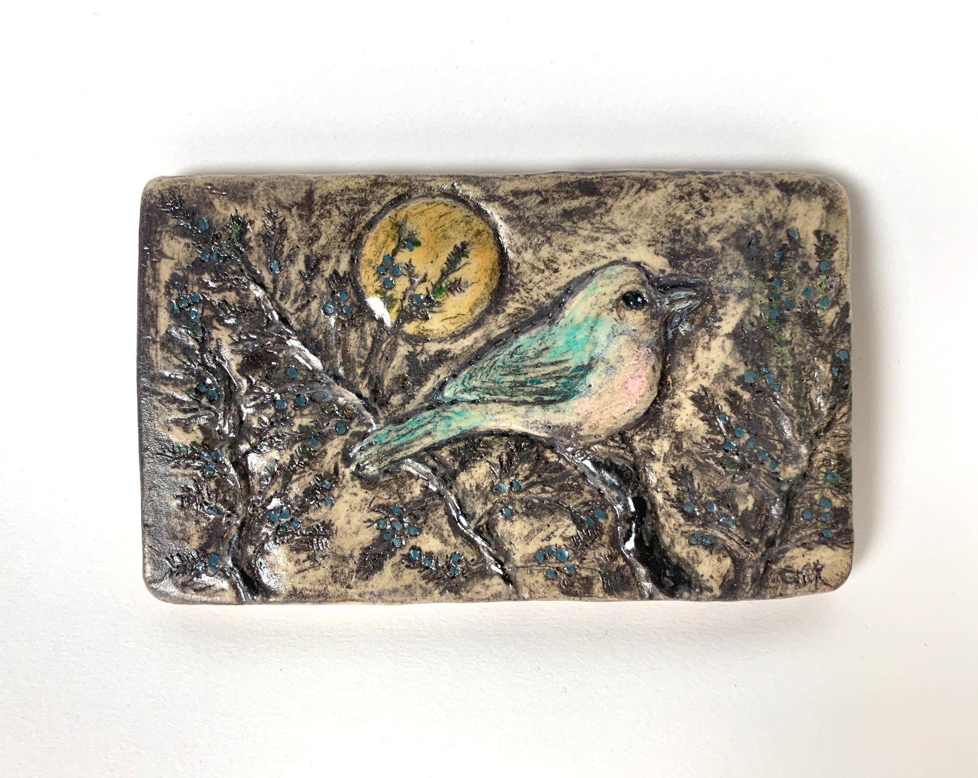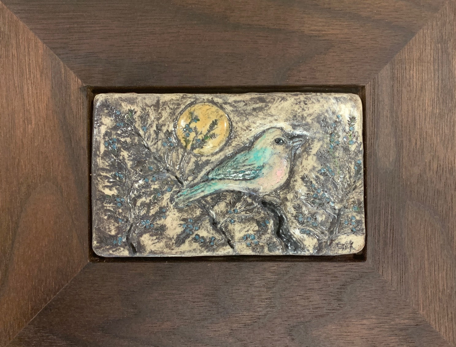 Rustic hand-carved clay bird tile with handmade walnut frame.